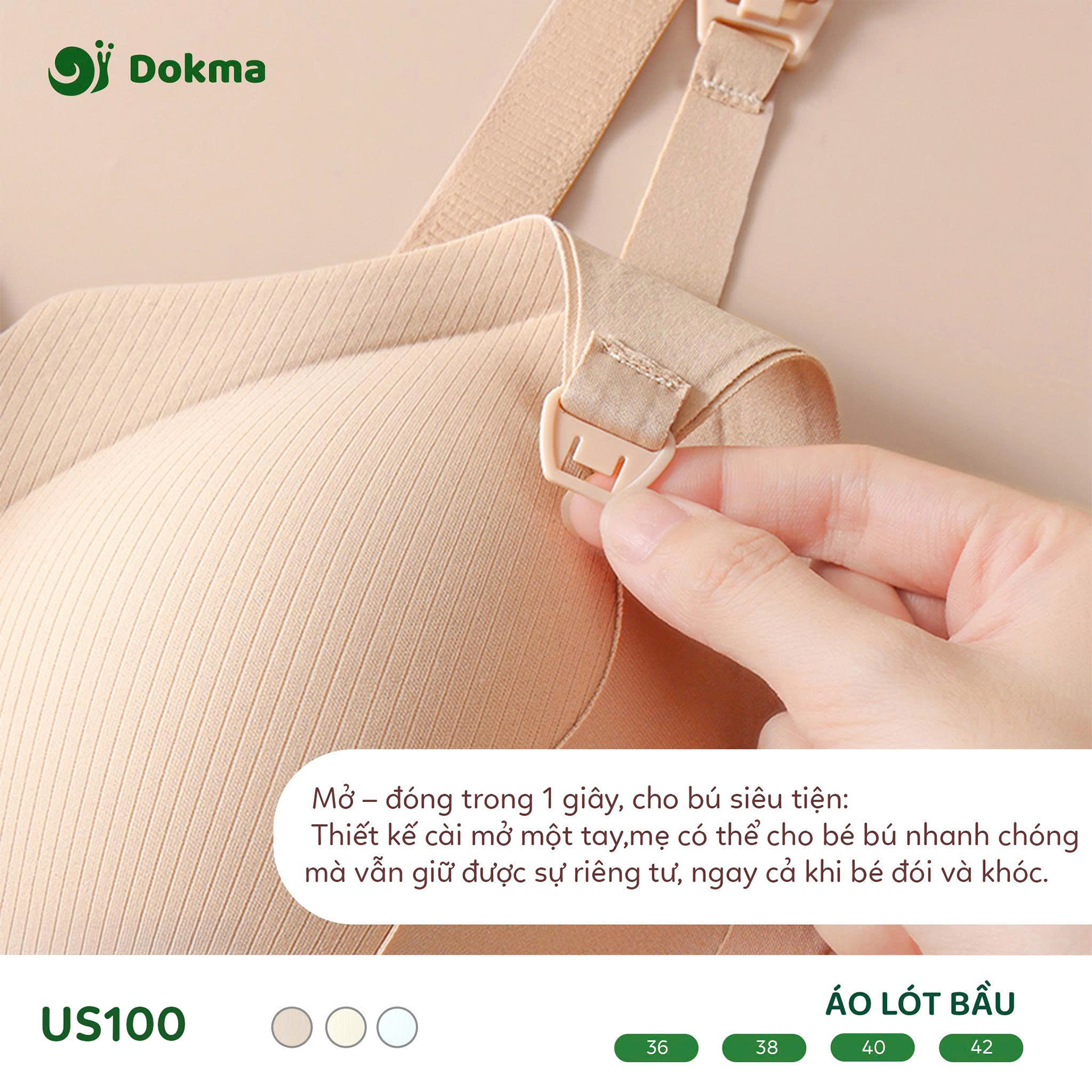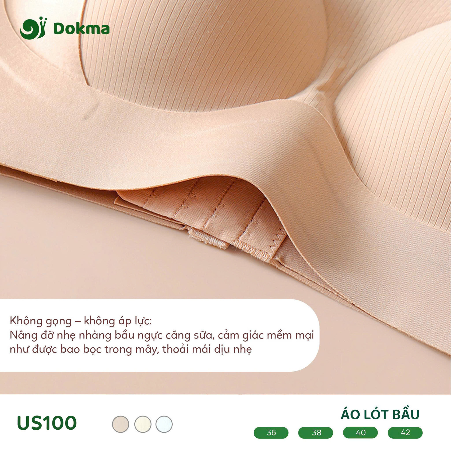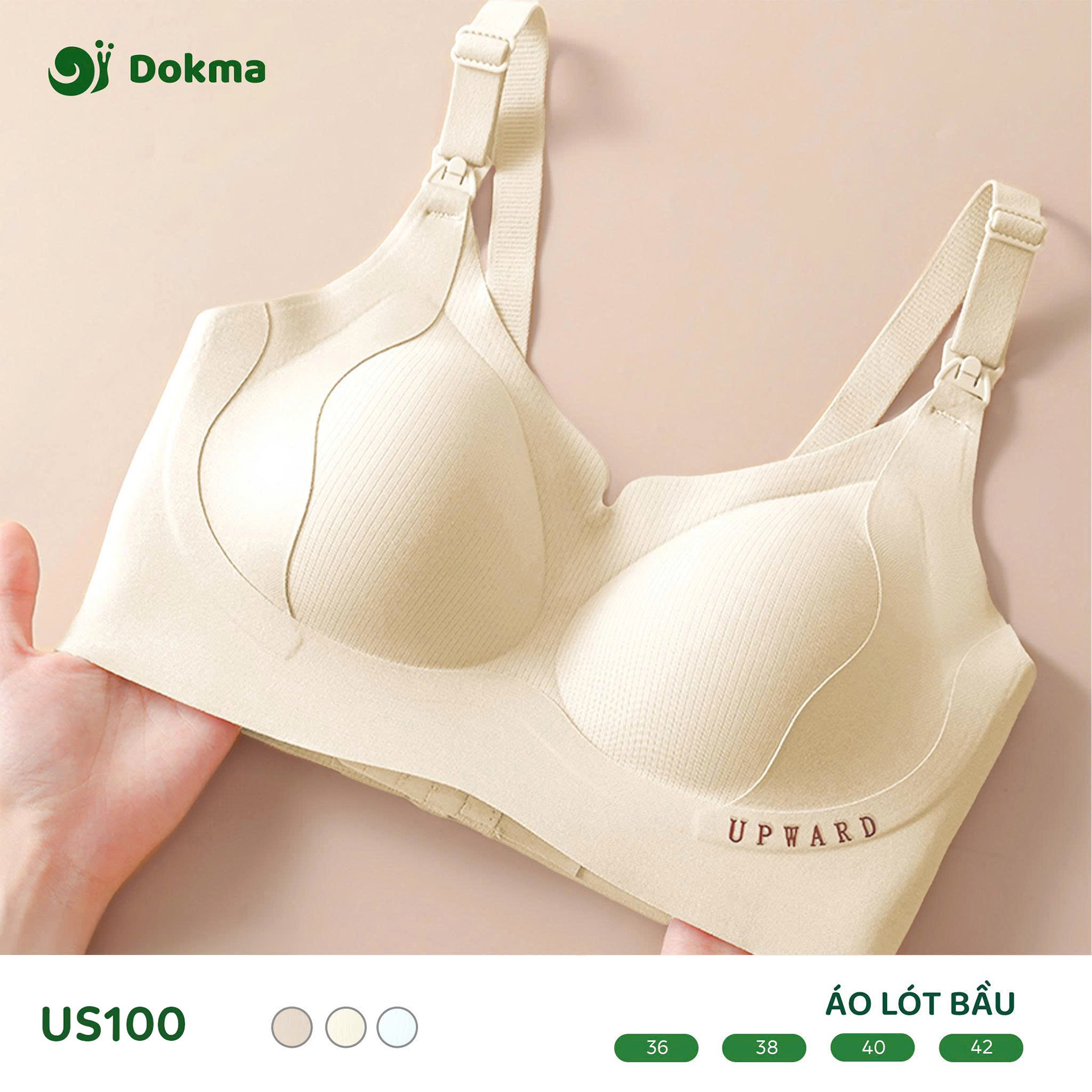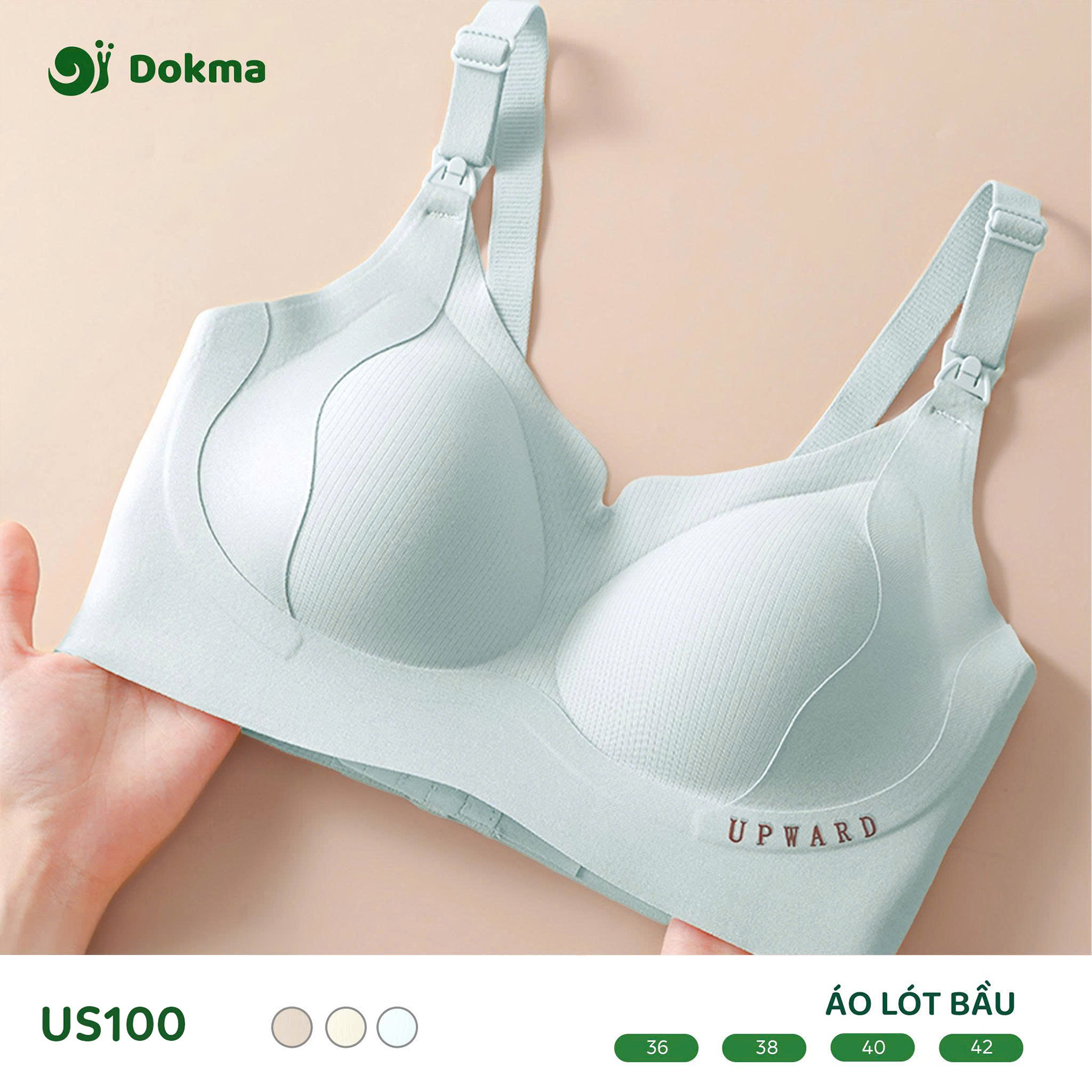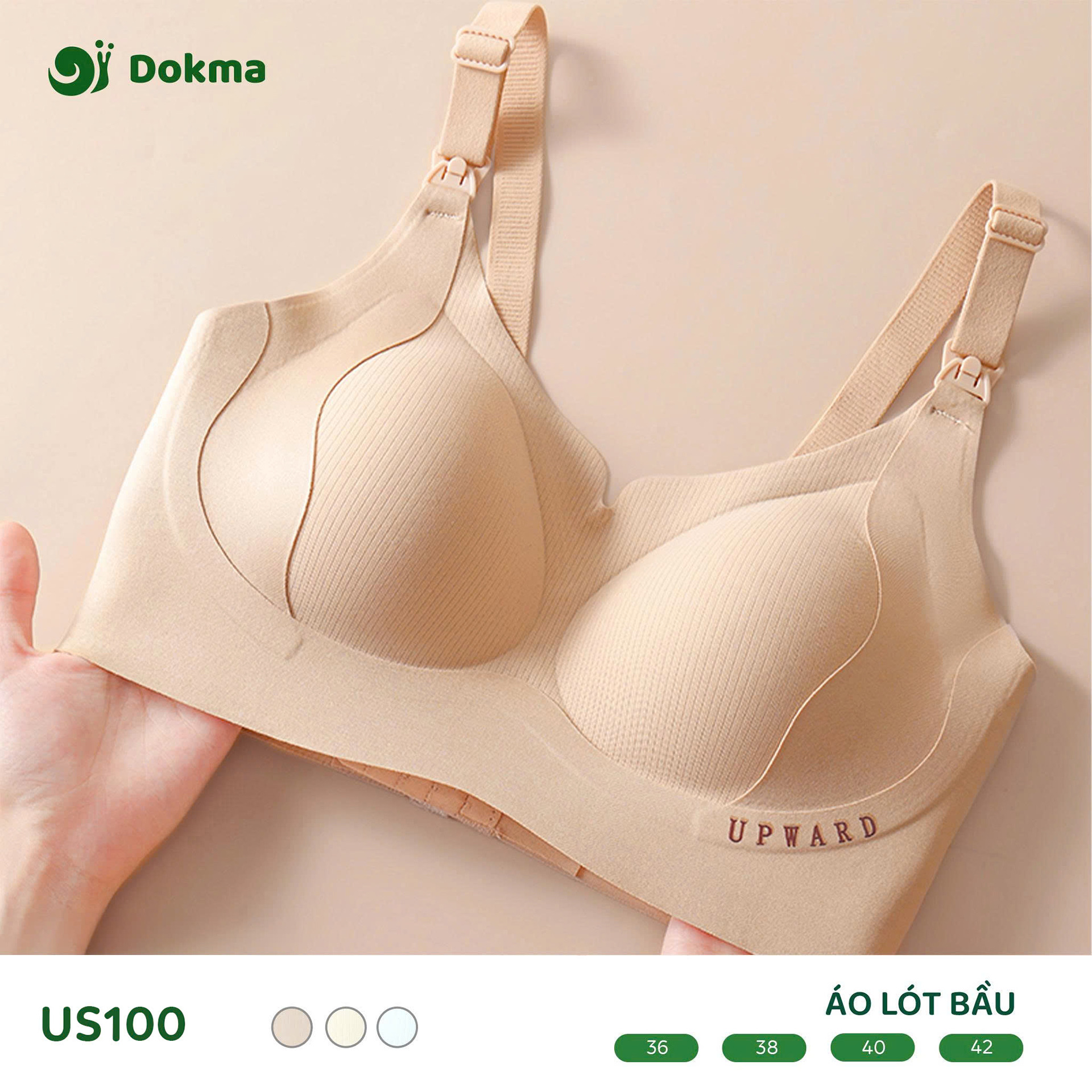 Áo lót bầu Dokma US100 là mẫu áo lót chuyên dụng dành cho phụ nữ mang thai và sau sinh, được thiết kế để mang lại sự thoải mái, nâng đỡ hiệu quả với công nghệ định hình "Upward" và tiện lợi tối đa khi cho con bú.