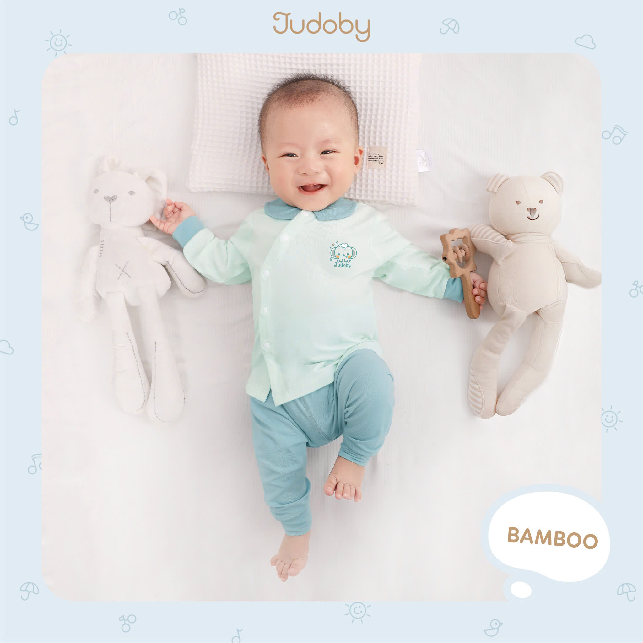 Bộ cài lệch dài tay Judoby mang phong cách dễ thương, thiết kế cổ tròn phối màu đáng yêu, giúp giữ ấm cho bé trong những ngày se lạnh.