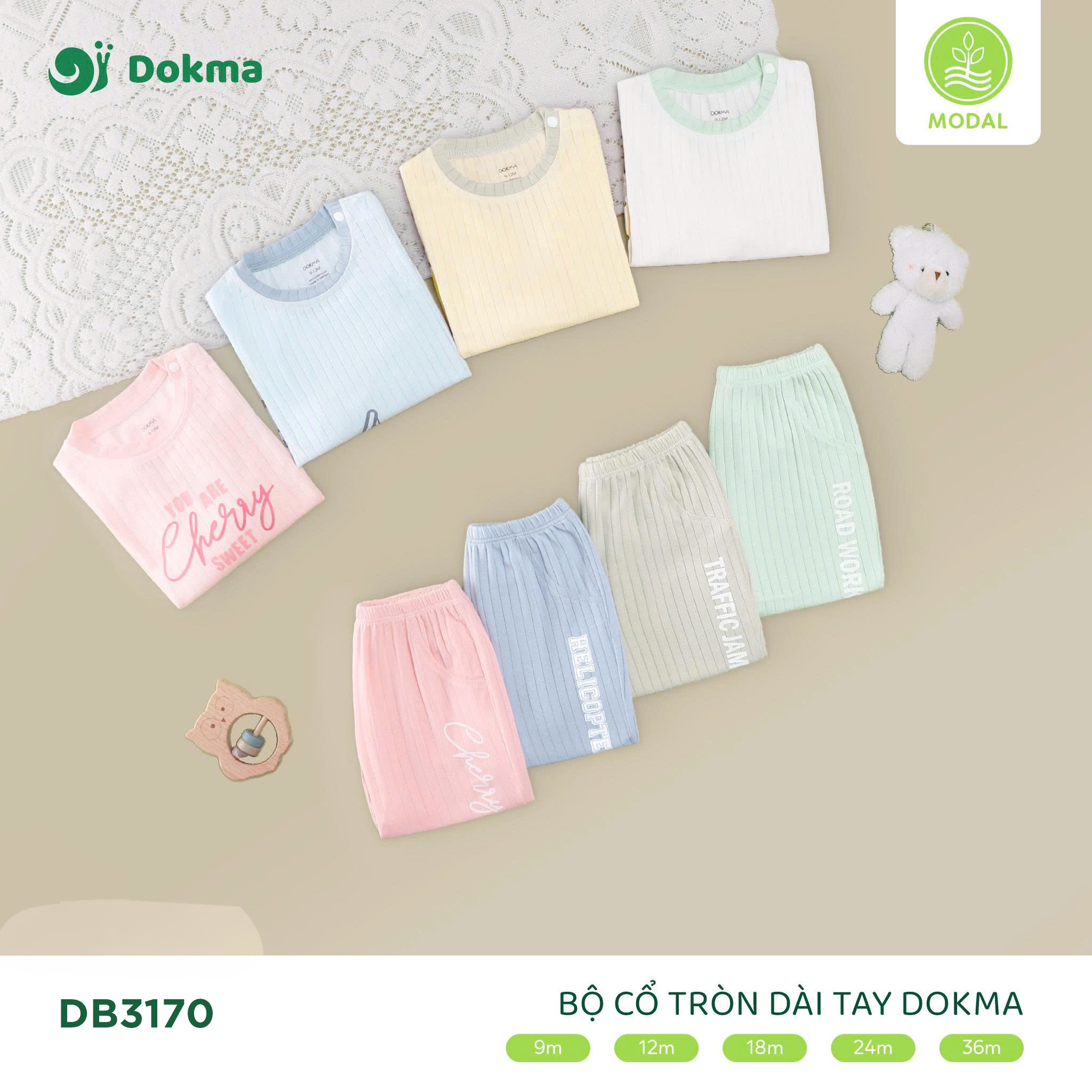 Bộ dài tay Dokma DB3170 thiết kế cổ tròn đơn giản, dễ mặc, với họa tiết in dễ thương nổi bật, mang lại vẻ ngoài đáng yêu cho bé. Chất liệu modal cao cấp mềm mại, thoáng mát, thấm hút tốt, an toàn cho da nhạy cảm, giúp bé thoải mái cả ngày dài.
