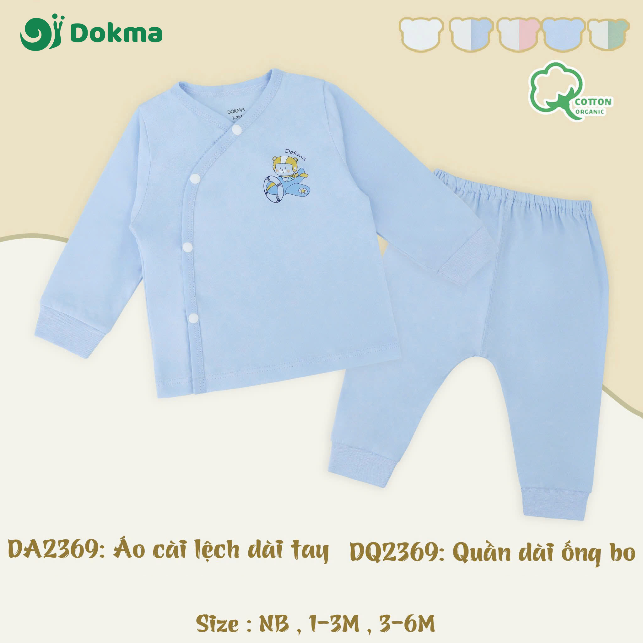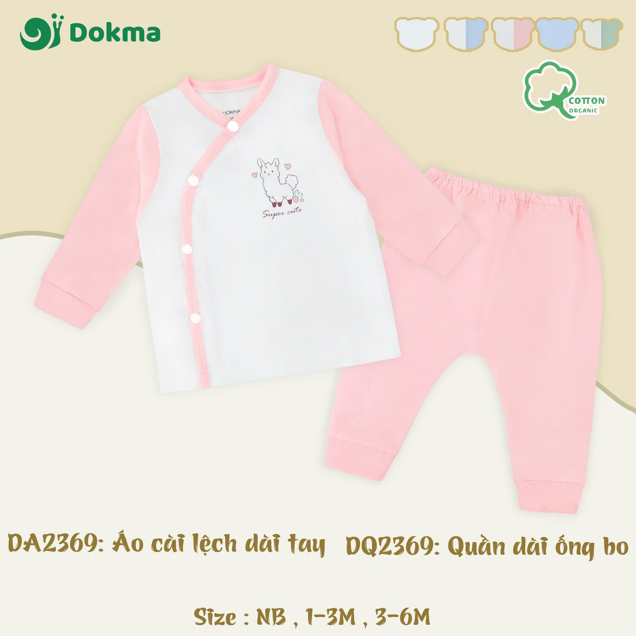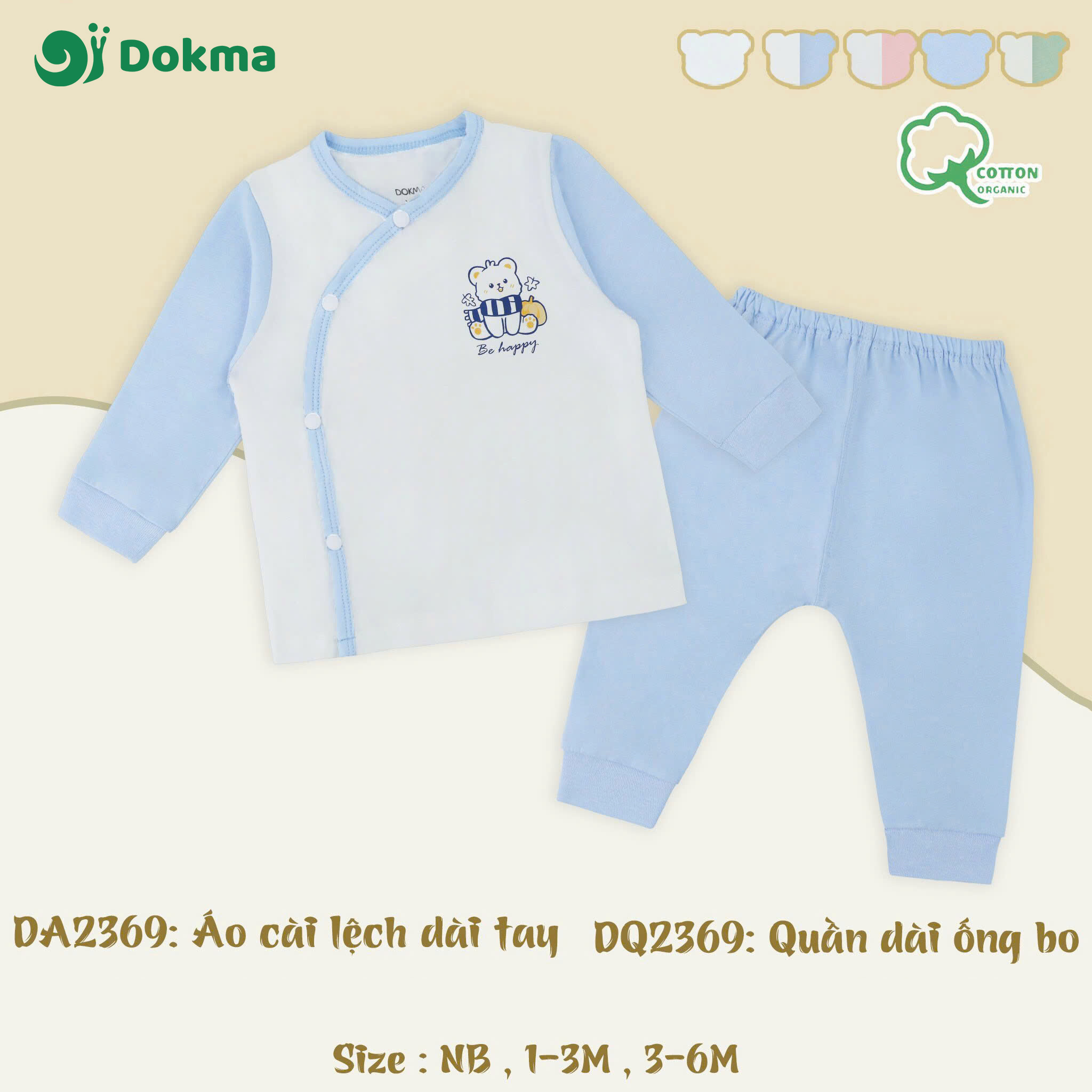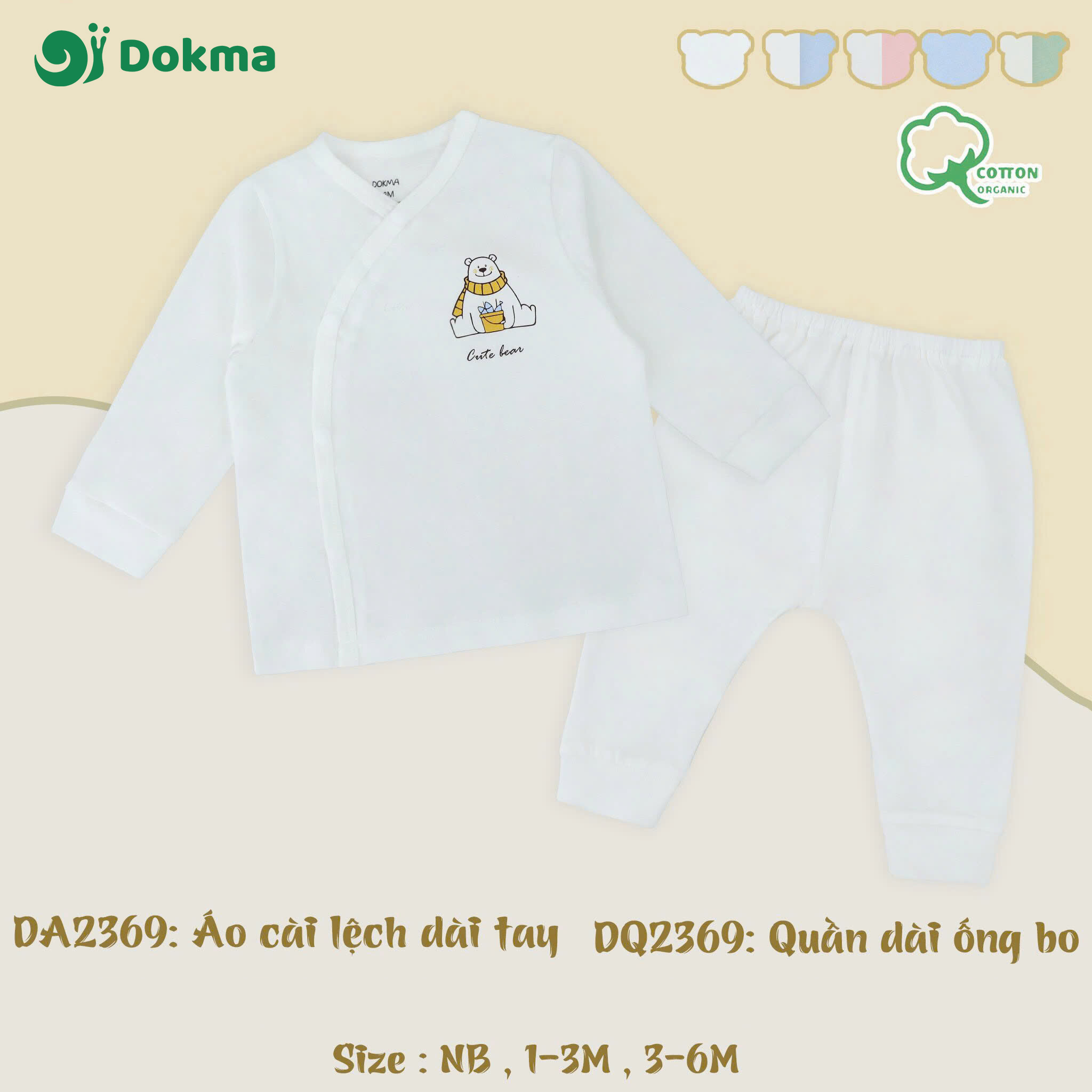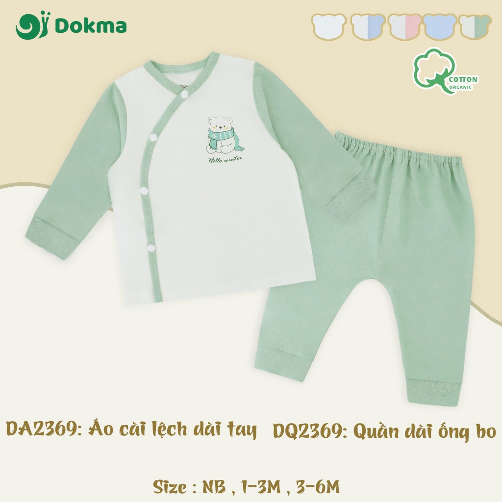 Bộ quần áo sơ sinh Dokma DA2369 – DQ2369 gồm áo cài lệch dài tay và quần dài ống bo, thiết kế tinh tế với họa tiết gấu, thỏ, cừu… ngộ nghĩnh, đáng yêu. Chất liệu cotton organic cao cấp, mềm mại, thoáng mát, an toàn tuyệt đối cho da nhạy cảm của bé sơ sinh. Dáng quần bo gấu giữ ấm tốt, áo cài lệch tiện lợi giúp mẹ dễ dàng mặc cho bé.