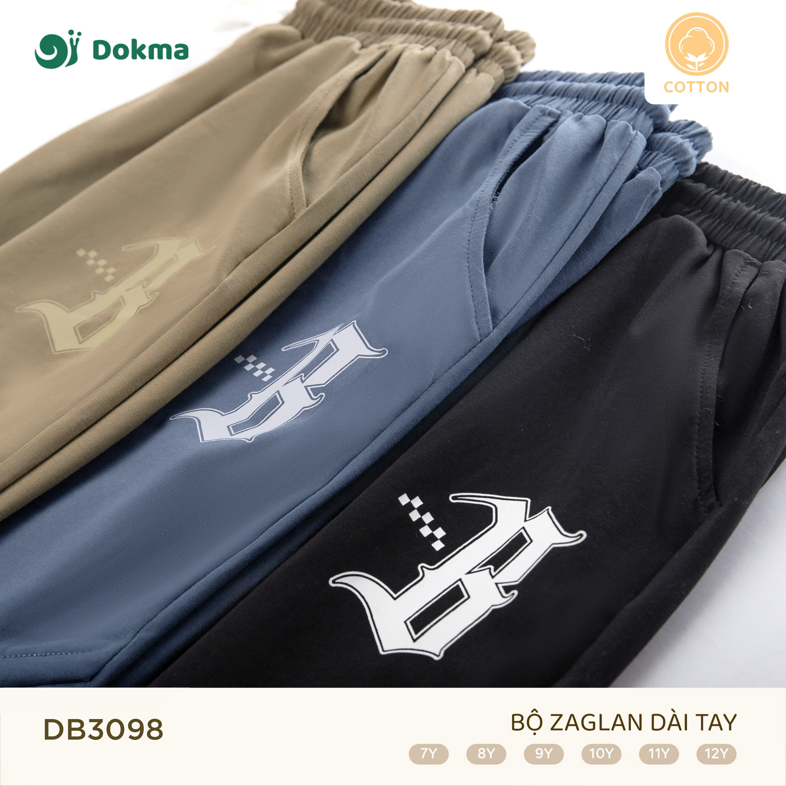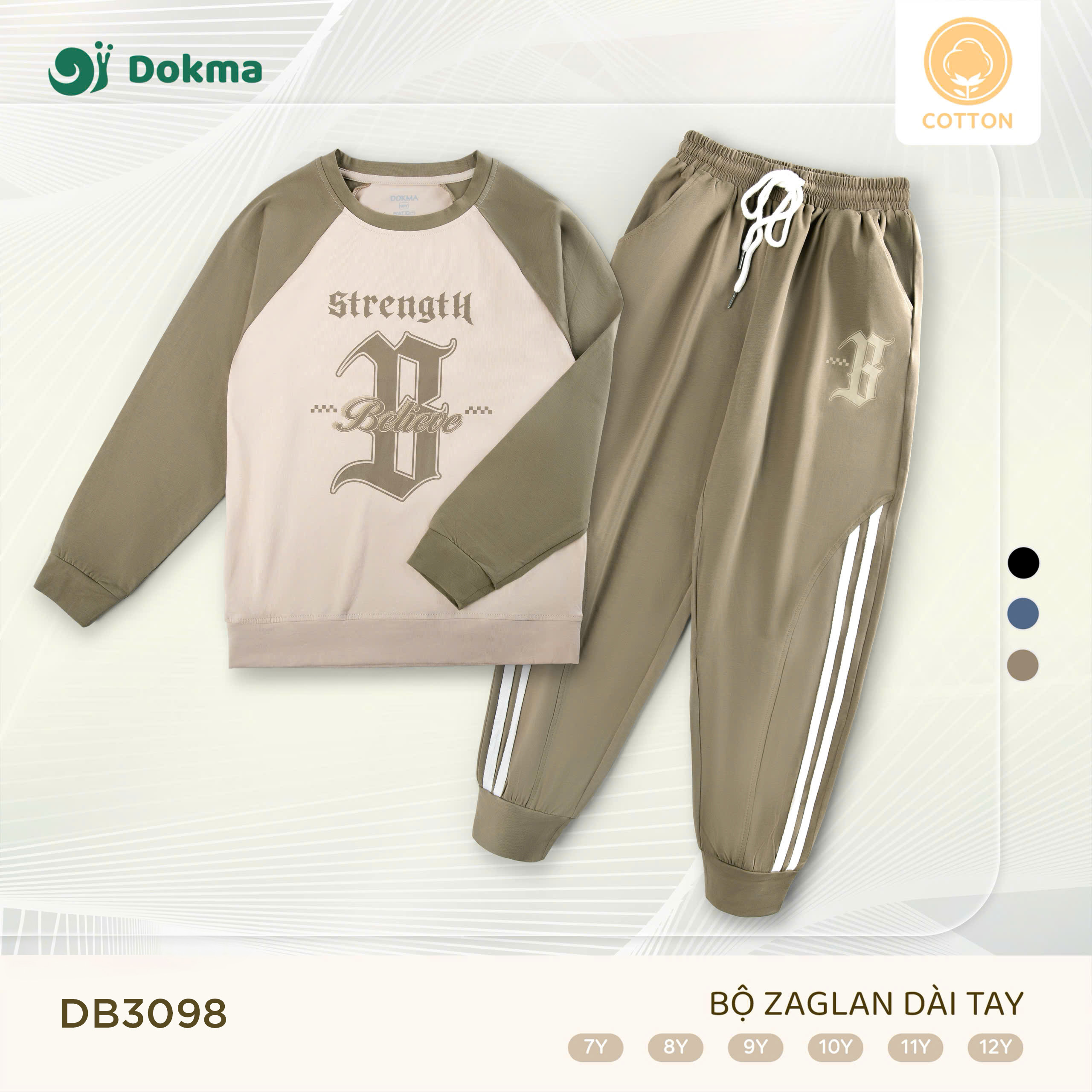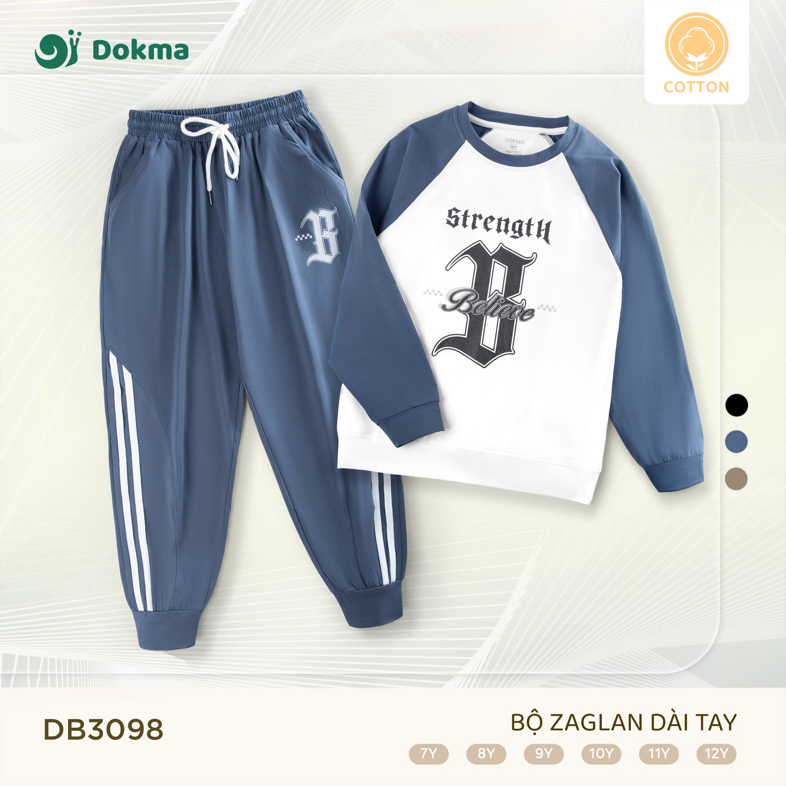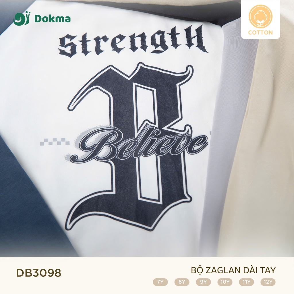 Bộ quần áo dài tay trẻ em Dokma DB3098 thiết kế raglan khỏe khoắn, họa tiết chữ Strength – Believe cá tính. Chất liệu cotton cao cấp, co giãn thoải mái, an toàn cho da, phù hợp cho bé diện đi học, đi chơi hay vận động ngoài trời.