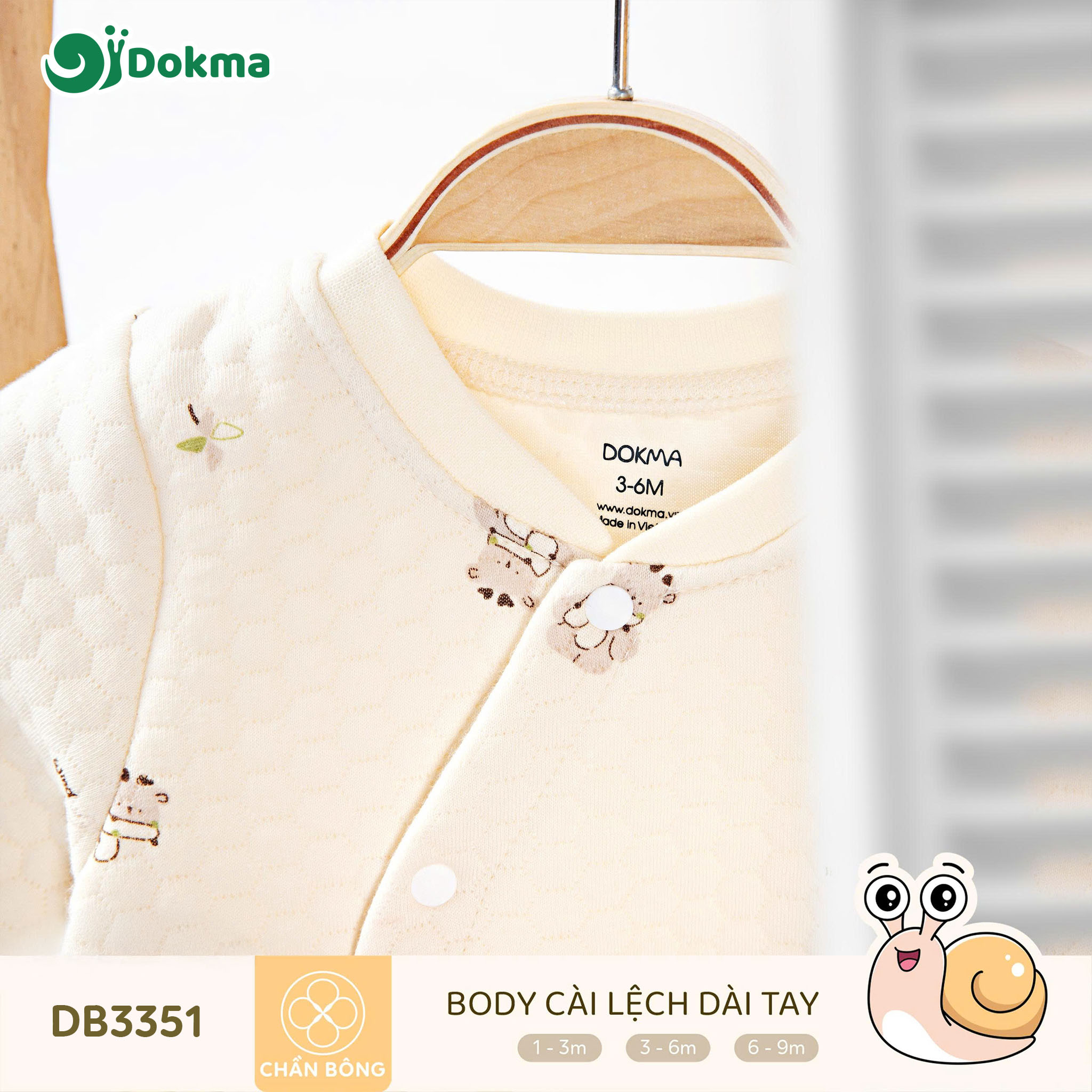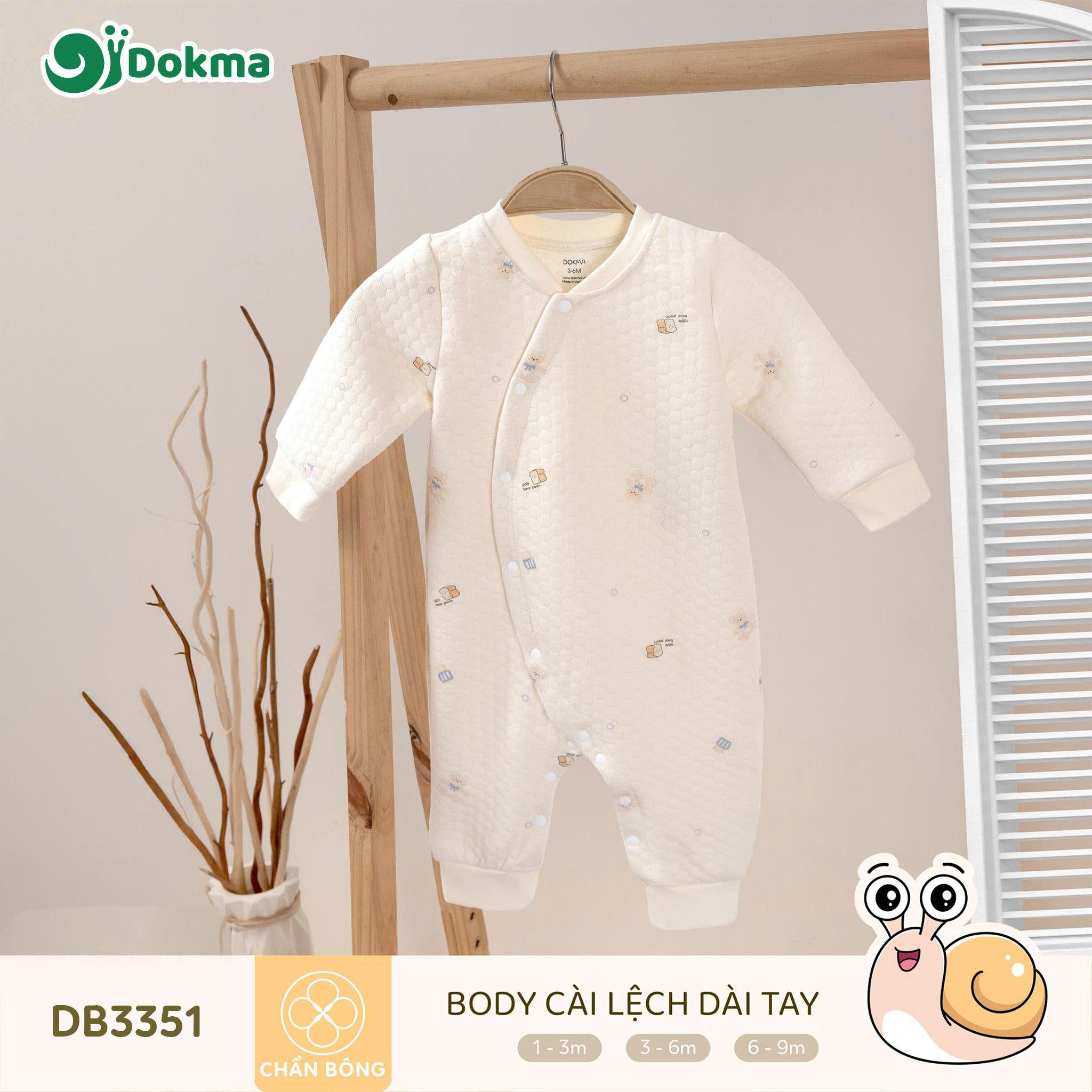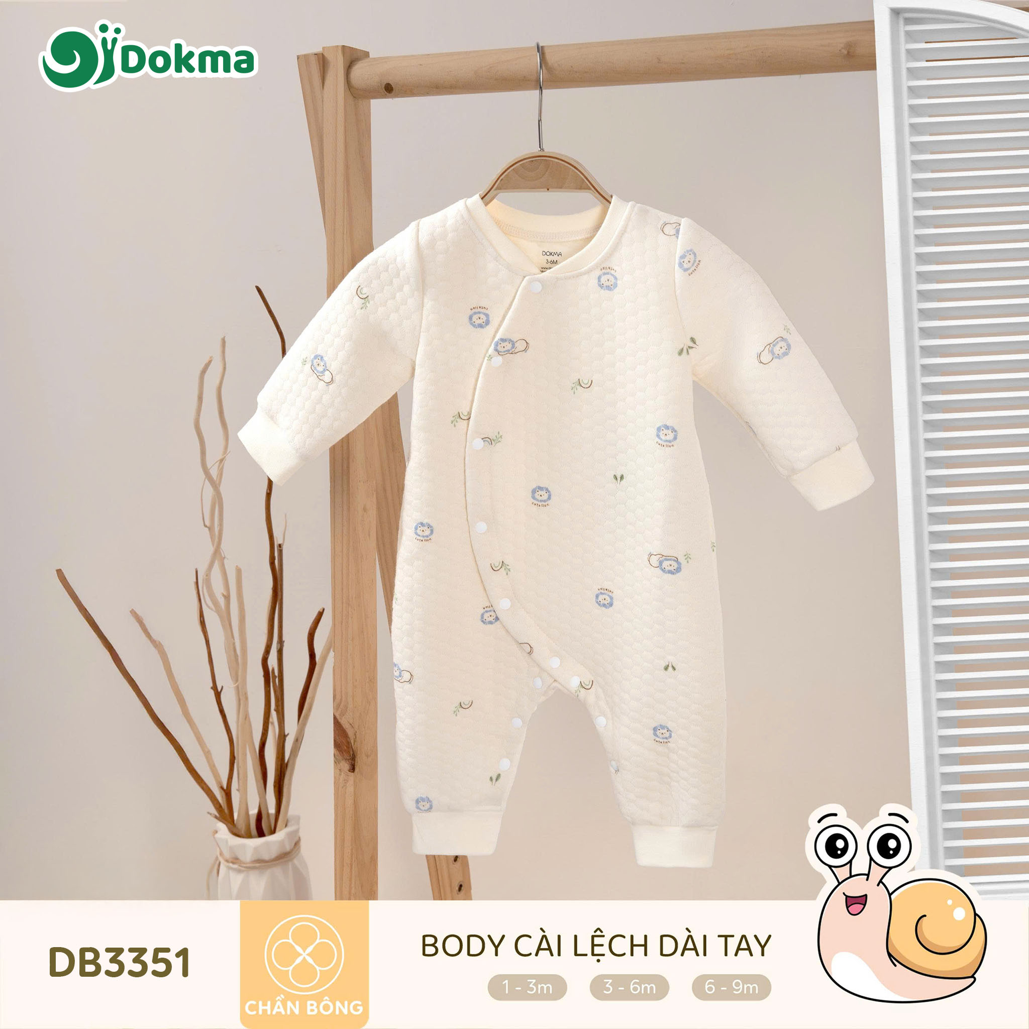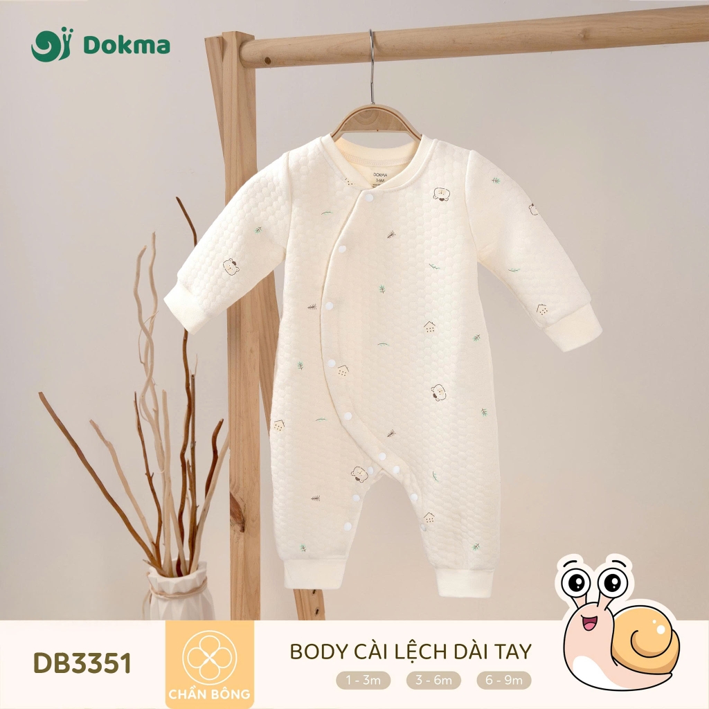 Bộ body Cài lệch dài tay bé trai/bé gái Dokma DB3351 được làm từ chất liệu chần bông mềm mại, thoáng khí, với bề mặt vải bông nhẹ, giúp giữ ấm tốt mà vẫn tạo cảm giác dễ chịu cho bé. Chất vải có độ dày vừa phải, đứng form nhưng vẫn co giãn nhẹ, thấm hút mồ hôi tốt, phù hợp cho bé mặc trong nhiều điều kiện thời tiết, đặc biệt là khi nằm ngủ hoặc trong những ngày se lạnh.