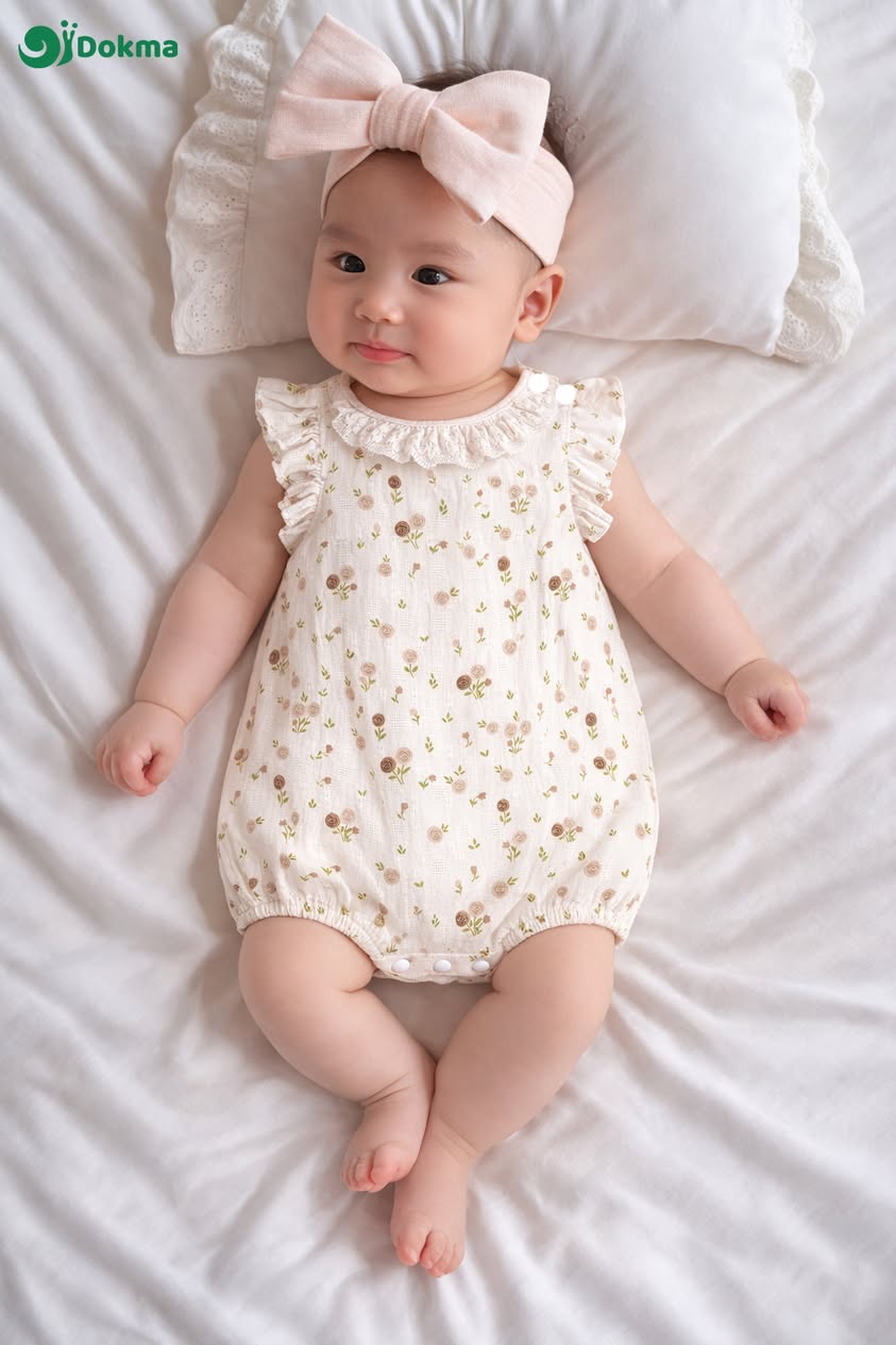 Thiết kế body liền thân cộc tay với phần tay bèo nhẹ nhàng tạo điểm nhấn đáng yêu và tinh tế. Họa tiết hoa nhí nhỏ xinh trên nền vải màu kem mang phong cách dịu dàng, thanh lịch. Cúc bấm phía dưới tiện lợi cho việc thay tã nhanh chóng. Form dáng rộng rãi, ôm vừa phải, phù hợp cho bé mặc ở nhà, đi chơi hoặc dạo phố.