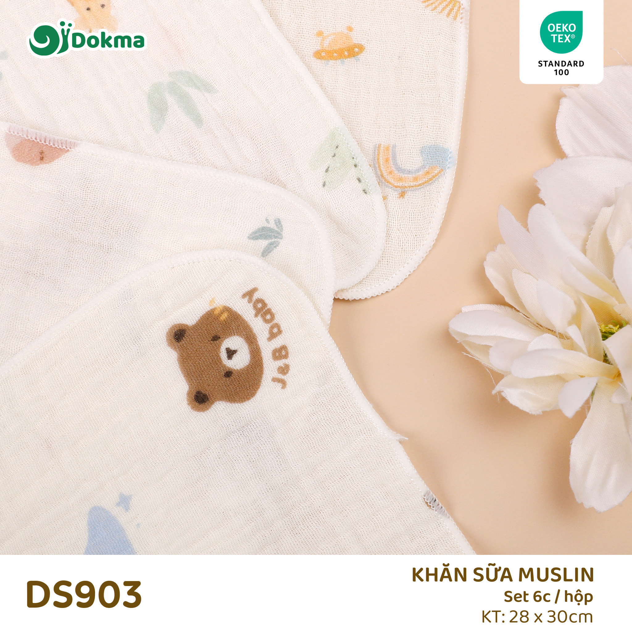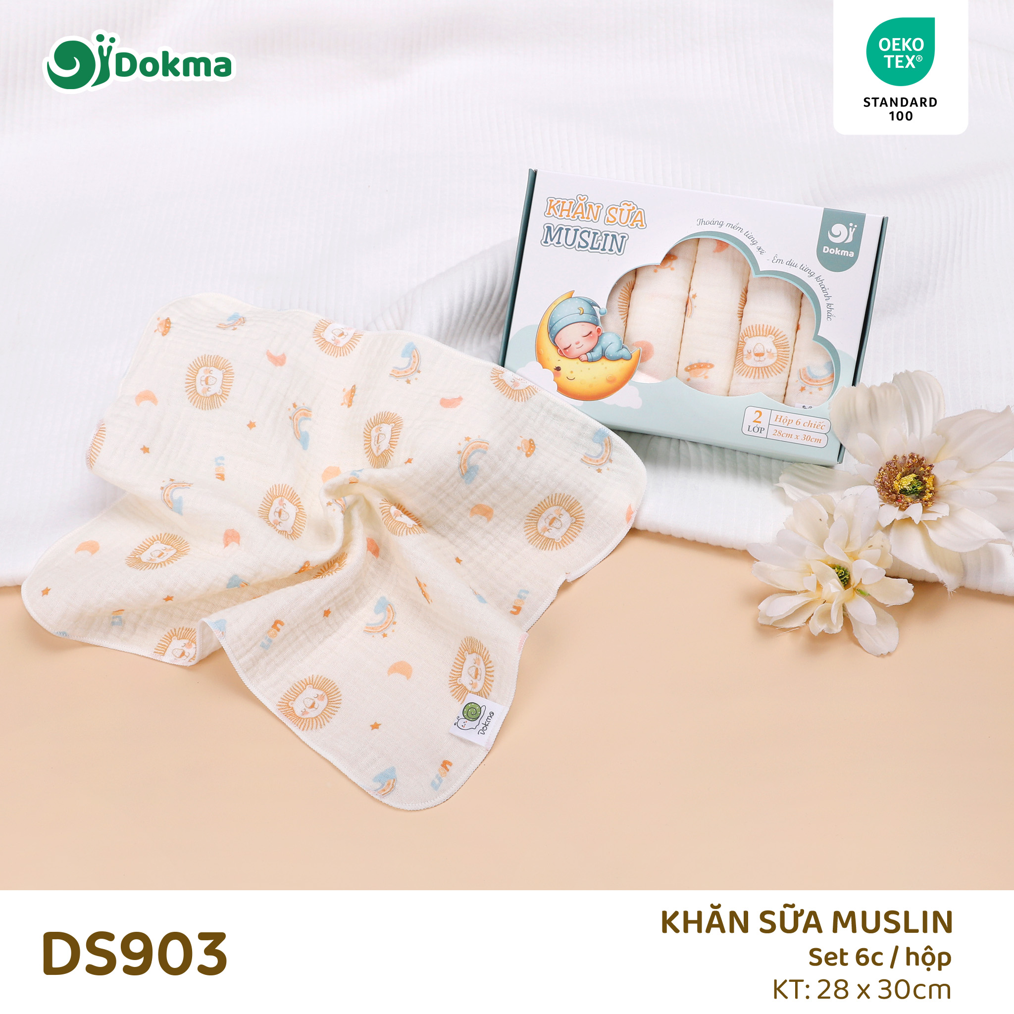 Khăn sữa Muslin Dokma DS903 được làm từ chất liệu muslin 100% cotton mềm mại, nhẹ và thoáng khí, an toàn cho làn da nhạy cảm của bé sơ sinh và trẻ nhỏ. Bề mặt vải mịn, khả năng thấm hút mồ hôi và sữa tốt, giúp bé luôn khô thoáng, dễ chịu trong suốt quá trình sử dụng. Chất vải muslin càng giặt càng mềm, bền đẹp theo thời gian.