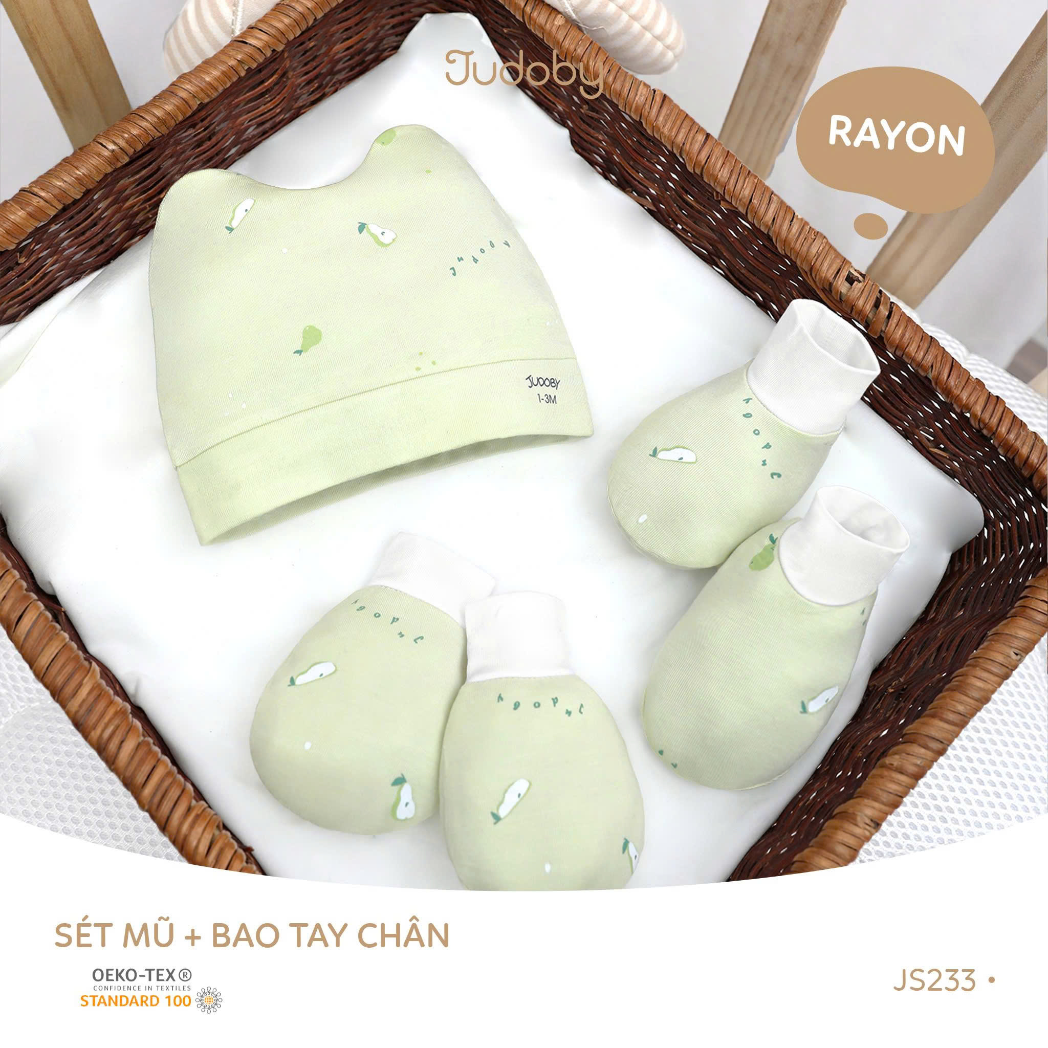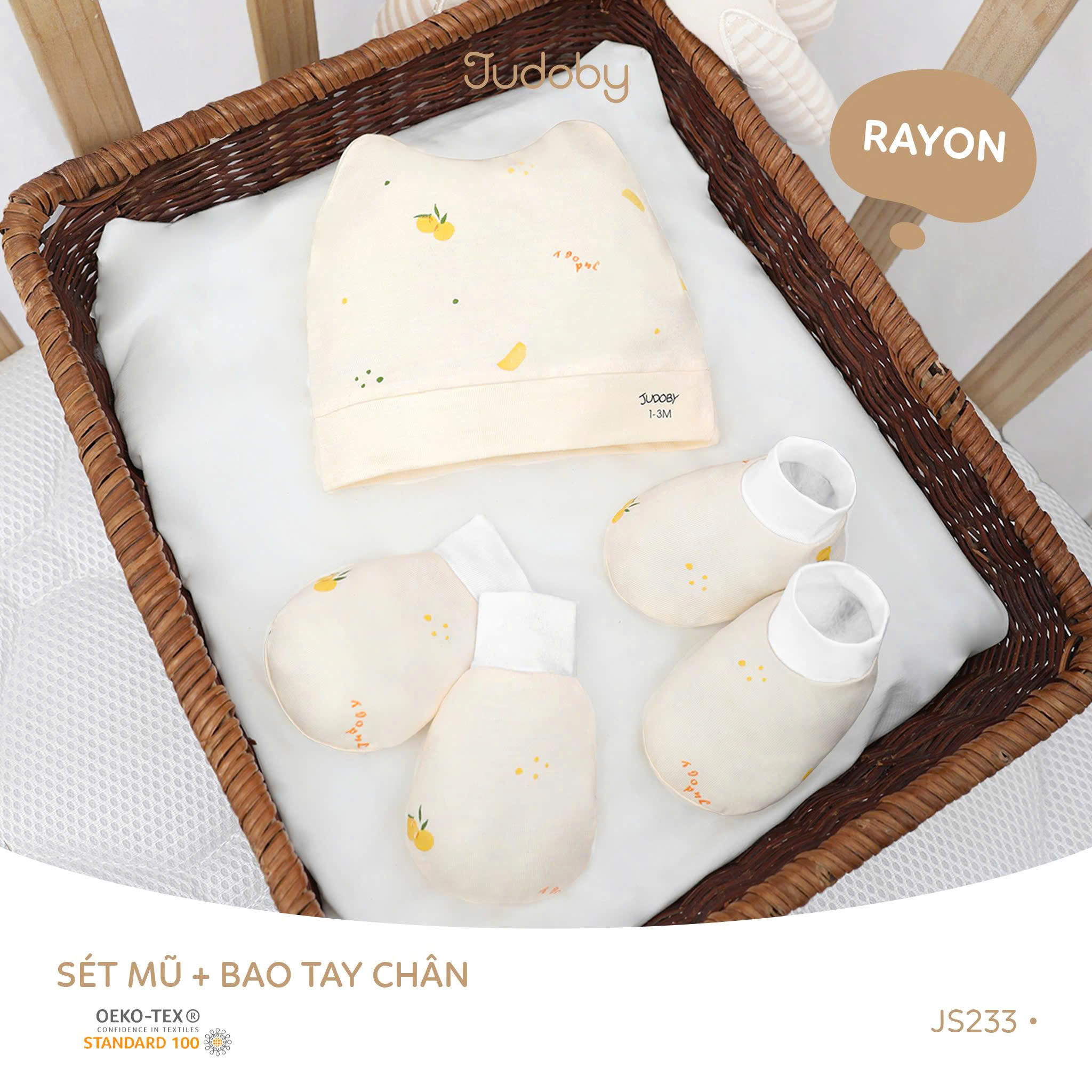 Sét mũ + bao tay chân Judoby – lựa chọn mềm mại và an toàn cho bé sơ sinh từ 1–3 tháng. Chất liệu rayon cao cấp, co giãn nhẹ nhàng, thấm hút tốt, không gây bí bách. Đạt chuẩn OEKO-TEX, phù hợp sử dụng quanh năm.