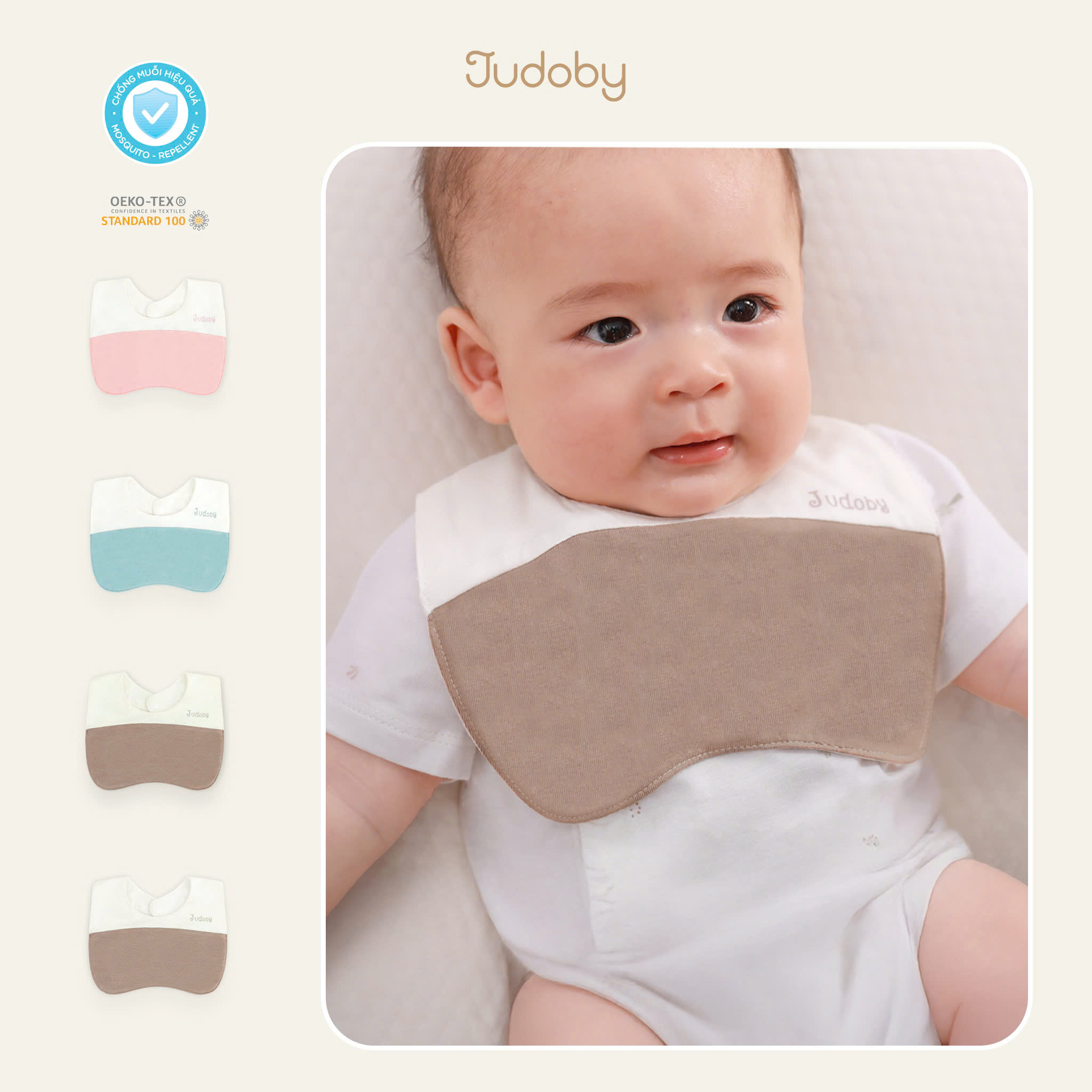 Yếm cài khuy Judoby được thiết kế rộng rãi, thoái mái, giữ bé luôn sạch sẽ, thơm tho.